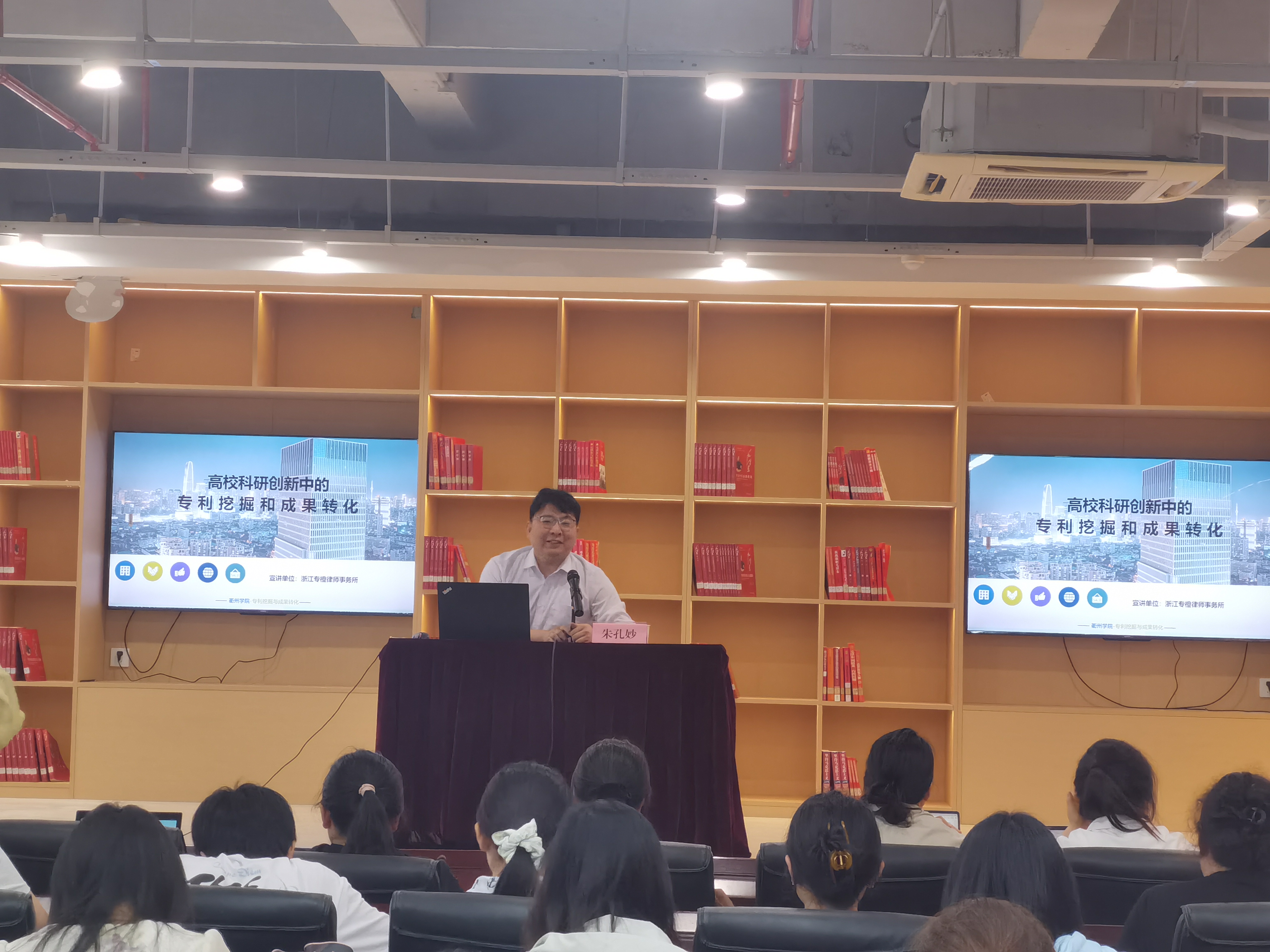 讲座分为两部分。在第一部分"知识产权保护政策解读"中,市知识产权保护中心徐晖主任围绕国家及浙江最新知识产权政策展开深入分析,系统讲解了专利知识产权的申请流程、法律保护要点及侵权风险防范策略。第二部分聚焦"高校科研创新中的专利挖掘与成果转化",浙江专橙律师事务所朱孔妙讲解了专利的非正常申请,并重点分享了高校专利成果转化的法律支持。